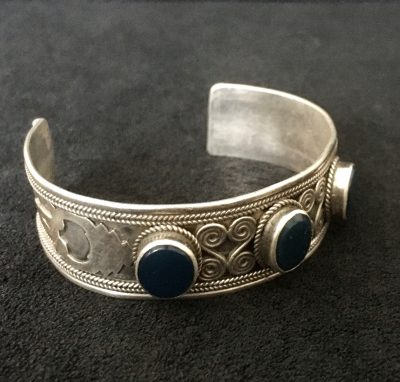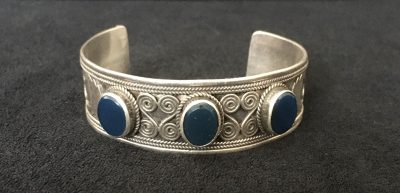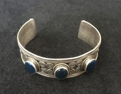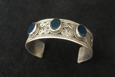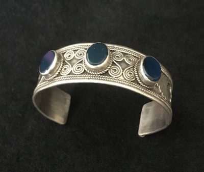 Vintage 925 Sterling Silver Cuff Bracelet Bangle With Green Agate Stones with classical decorative design and style. Complemented with three exquisite oval Blue Green stones in good condition with very nice patina this charming litle piece of vintage jewelery will blend perfect with any outfit weather formal or casual atire.